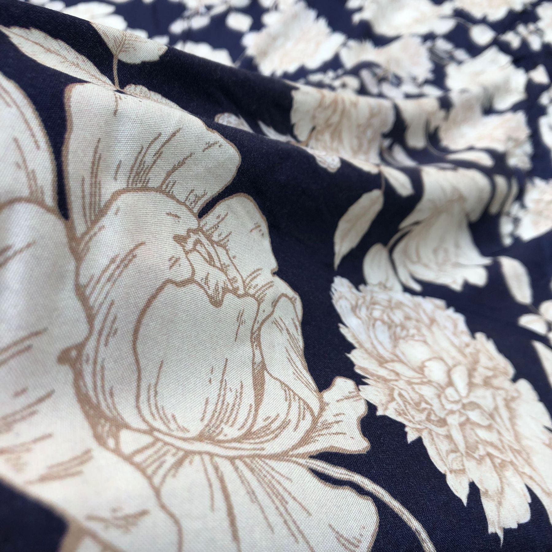 Tamamen viskon, elbiselik kumaş, doğal elyaf olduğu için yazlık olarak kullanılabilir, kaliteli emprime dokumadır.